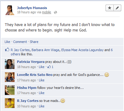 “Everything’s gonna fall into their right place and right time soon. Living a life to fulfill the expectations of other people isn’t healthy – if you are not happy doing it. Asking myself if I’m happy about it? Most likely true. I’m doing their way because it will make them happy, and seeing them happy makes me feel happier. My dreams of becoming someone may lost for now but I know that my God and His time will still be generous in sometime for me to fulfill the dreams of my success and my happiness. The worldly needs and the practical wants of the people around me bind me to do things that I am not good at, and do them excellently. It’s ironic, it’s difficult but I guess, it is worth pursuing and determining.”